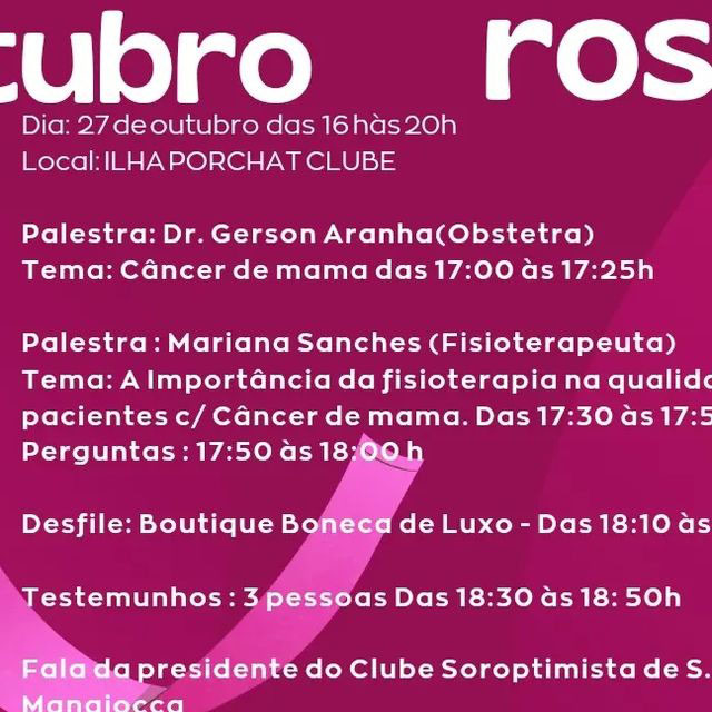 Tema: A Importância da fisioterapia na qualidade de vida p/ pacientes c/ Câncer de mama. Das 17:30 às 17:50 h